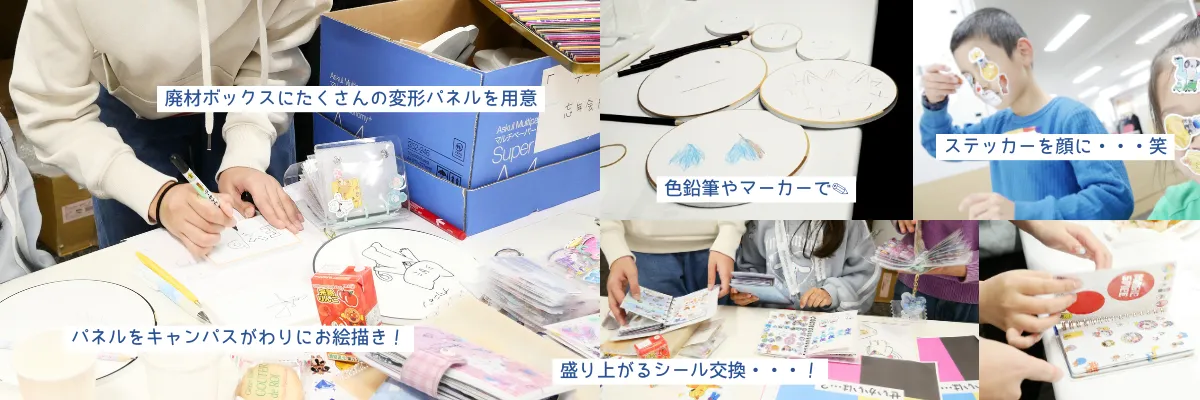 • 加工時の廃材 → クイズ回答用紙、ボード、キッズエリアのお絵描き用紙に
